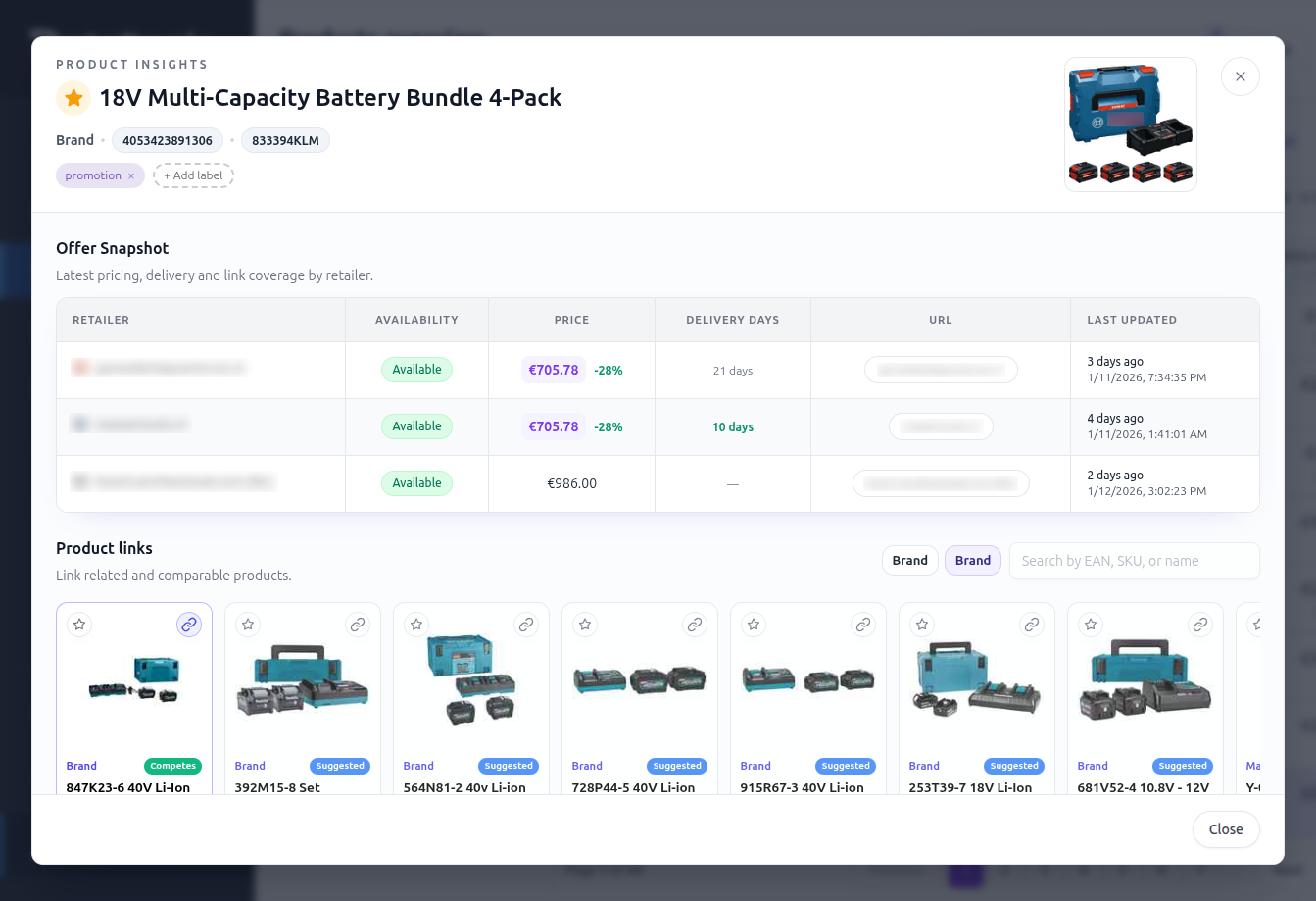Get instant insights into availability, pricing and content quality for all products. Spot opportunities, find missing products and see where gaps are costing you revenue.
